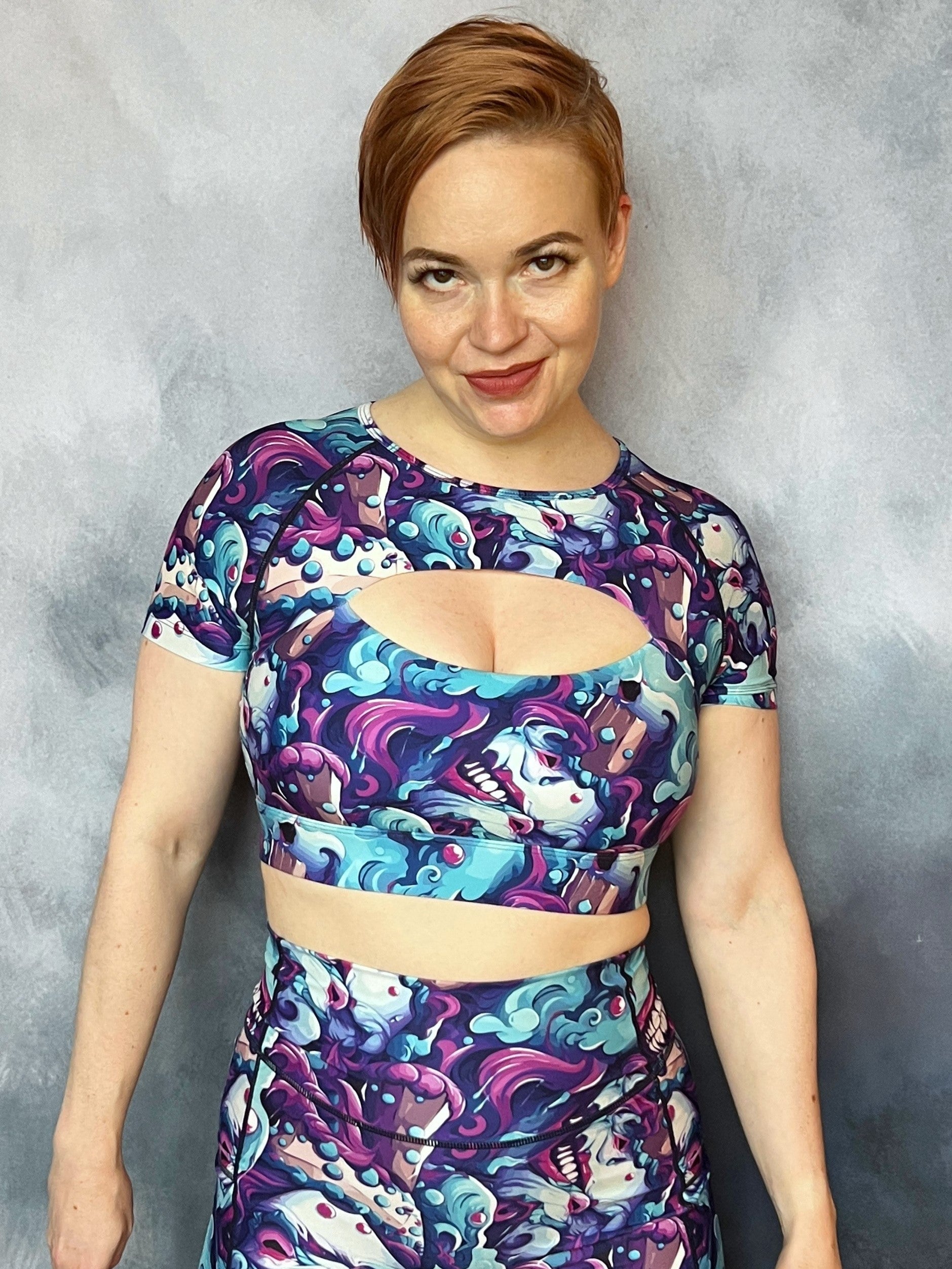 "Evil Grin" Active Wear Print – a bold graffiti artwork featuring sinister clown grins in striking turquoise and pink-purple contrasts. This edgy and provocative artwork is an excellent choice for those in search of intense and unique activewear designs. Make a statement with the "Evil Grin" print, immersing yourself in its dark and intriguing aesthetic.