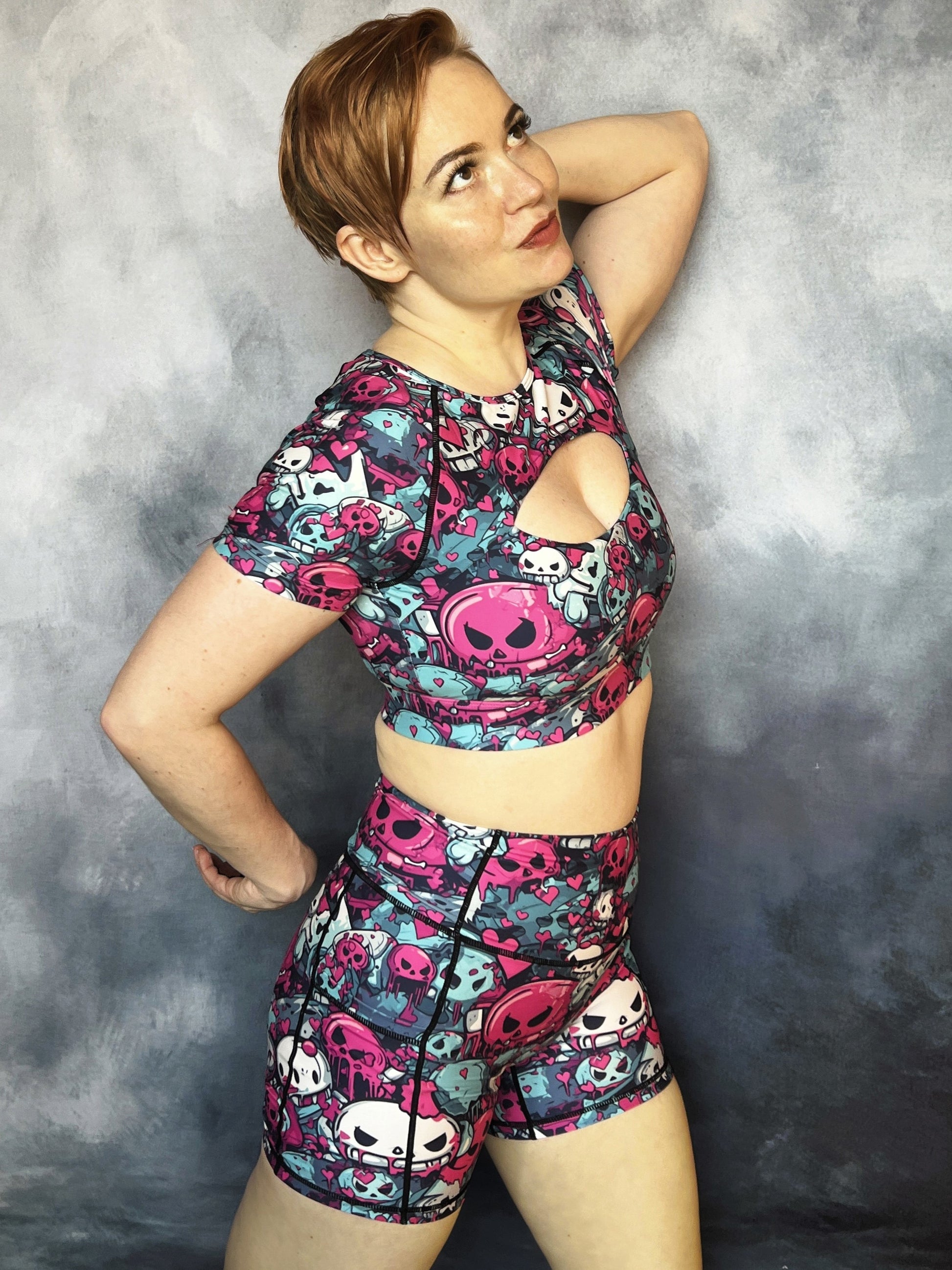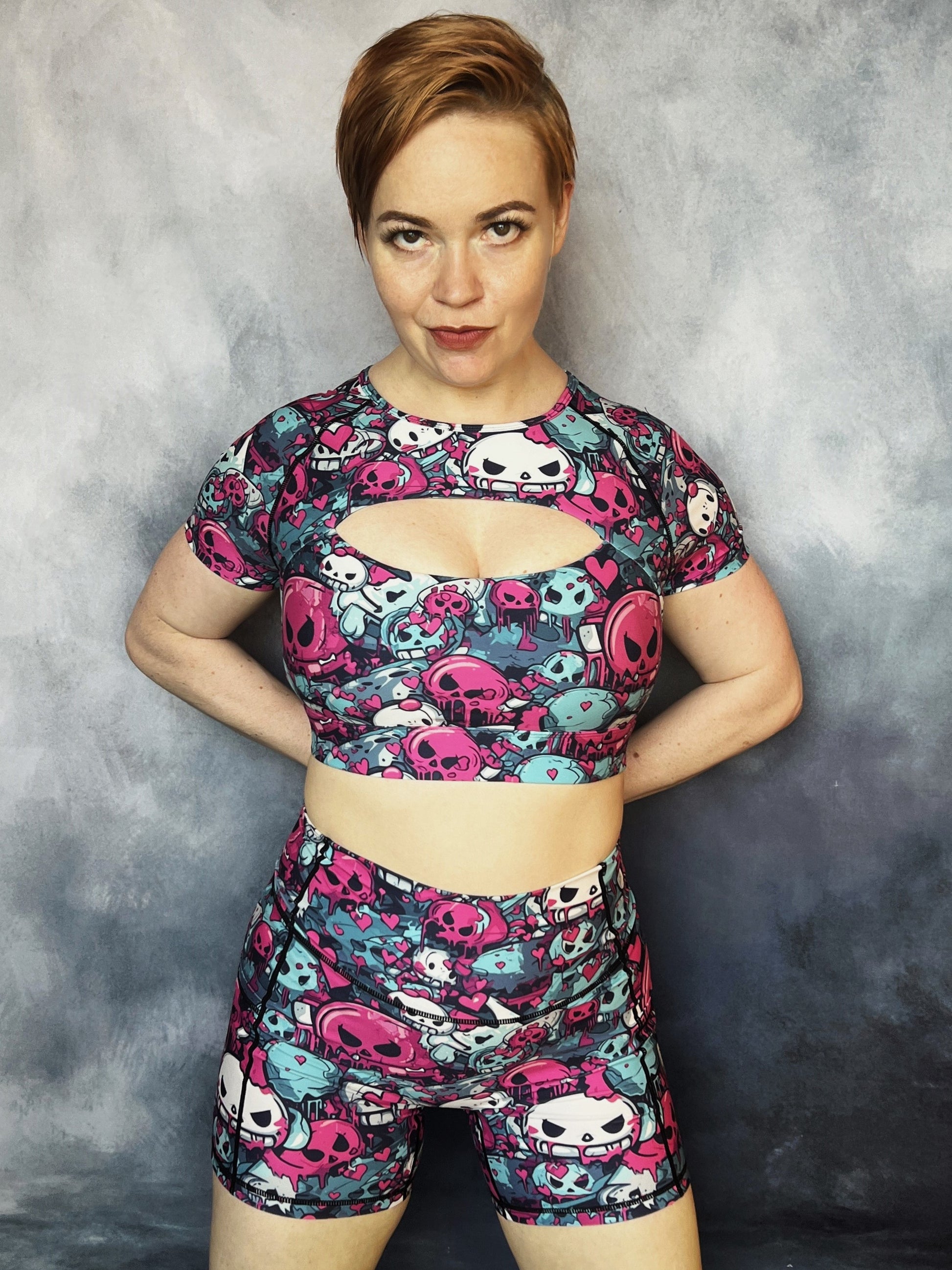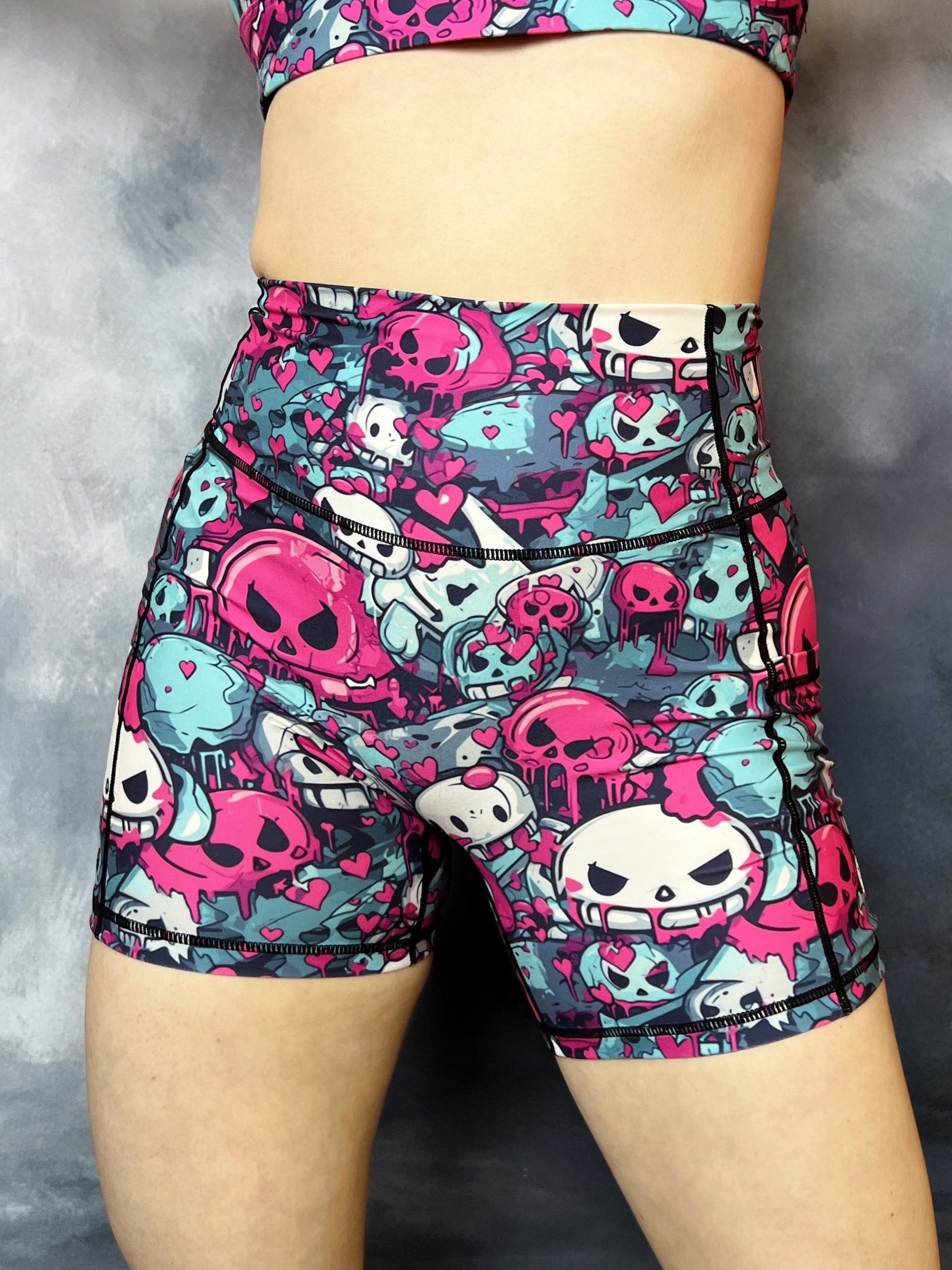 "Melting From Cuteness" Art Print – a striking graffiti masterpiece featuring skull-like creatures melting in vibrant turquoise, bright pink, black, and white. If you're on the hunt for sports attire with a truly unique and eye-catching pattern, this design is an ideal choice. Add a bold and edgy vibe to your activewear collection with these melting skull creatures.
